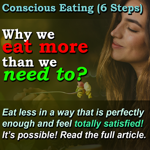 Only listen. Listen to the voice in your head that urges you to eat a lot quickly! Only recognizing these thoughts can free you from the need to eat much. But you need to be very aware. You cannot make it like learning a mantra and use it every time. Because every time you have different thoughts. And the more thoughts you catch, the more free you are to decide what to do. Without knowing what is in your head, you are completely defenseless to your habits. It's difficult, because you learned not to be present when you eat. It's easy to be present when you are meditating in a silent room. Being present in the moment of eating is one of the biggest challenges! But don't think about this before your meal. Don't think about it after your meal. Be present when you are eating and watch your thoughts in the moment when you are sitting at the dining table. In this state, you will already feel much better and much more free. You’ll already start to feel like you are not controlled by your habits, and it's fantastic. What should you do now? How should you eat? Watch your plate, watch the food, and start eating slowly. Look at your hands when you are touching the fork, sticking it to the food and look at it before you eat it. You don't need to be extra slow. You will feel it is the normal tempo! It'sdifferent, but good. You don't feel any urge to eat it fast. If you do it right you will realize now you aren’t thinking about other things (your problems, your work, and what to do next). You were always thinking about something else while eating. Now you give all your attention to eating. It's a fresh experience without any need.